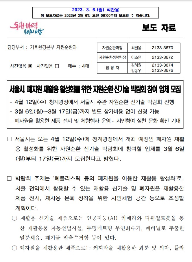 – 4월 12일(수) 청계광장에서 서울시 주관 자원순환 신기술 박람회가 열린다.